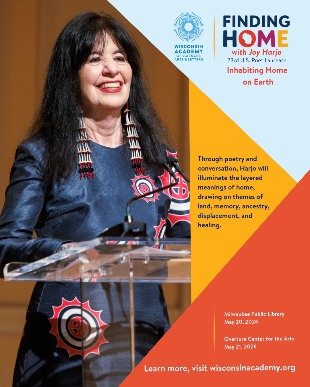 As part of its Finding Home series, the Wisconsin Academy presents Joy Harjo, internationally renowned performer, writer and 23rd Poet Laureate of the United States. Known for her powerful storytelling and deep exploration of Indigenous identity, Harjo’s work invites reflection on what it means to inhabit our home on earth—to belong to a place, a people, a history and a future.
